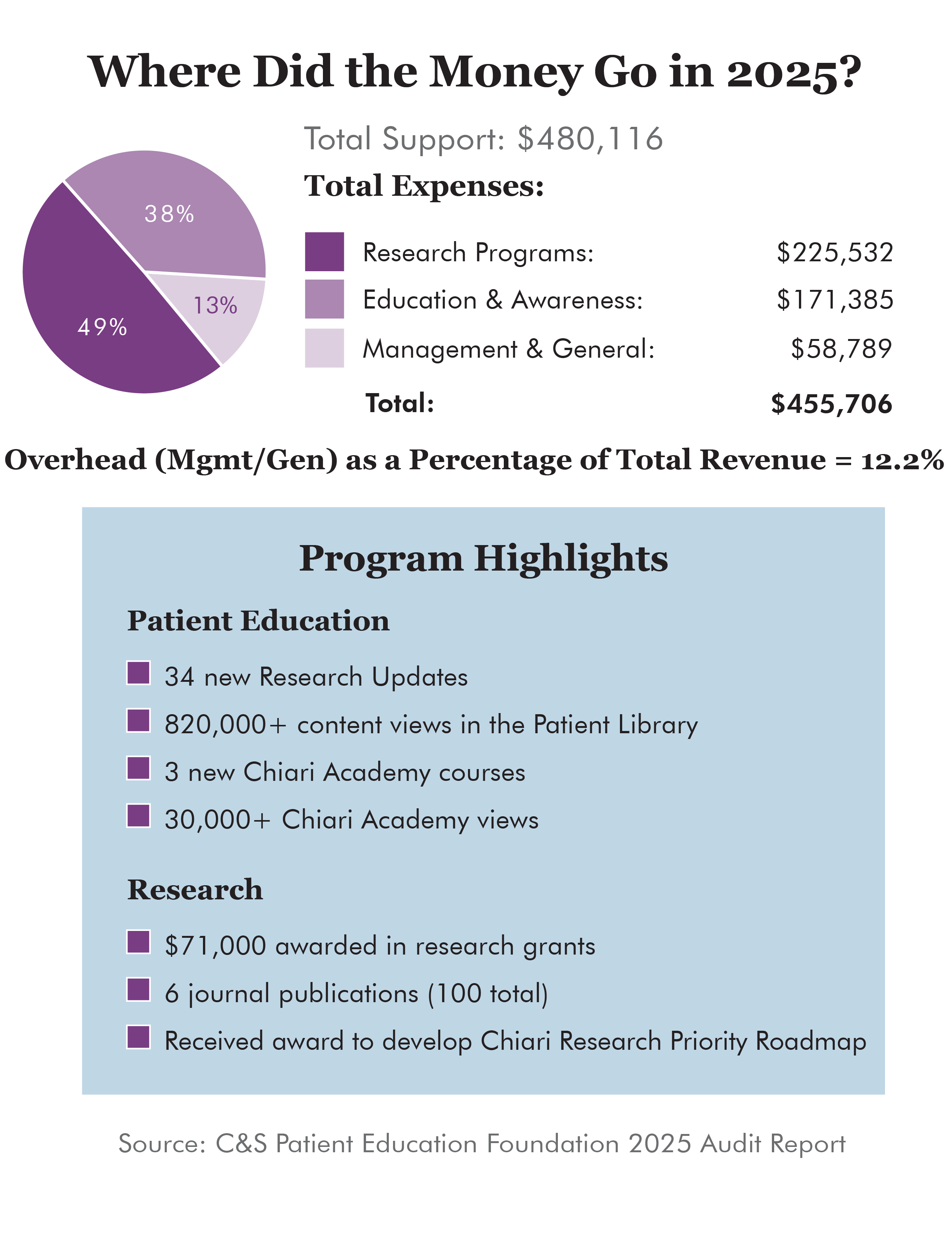As a public charity, Conquer Chiari is required to make our financial statements freely available to the general public; below are our yearly tax filings with the IRS (form 990s). We take great pride in delivering effective programs with very low overhead. This means that donors really are getting the most for their money.
